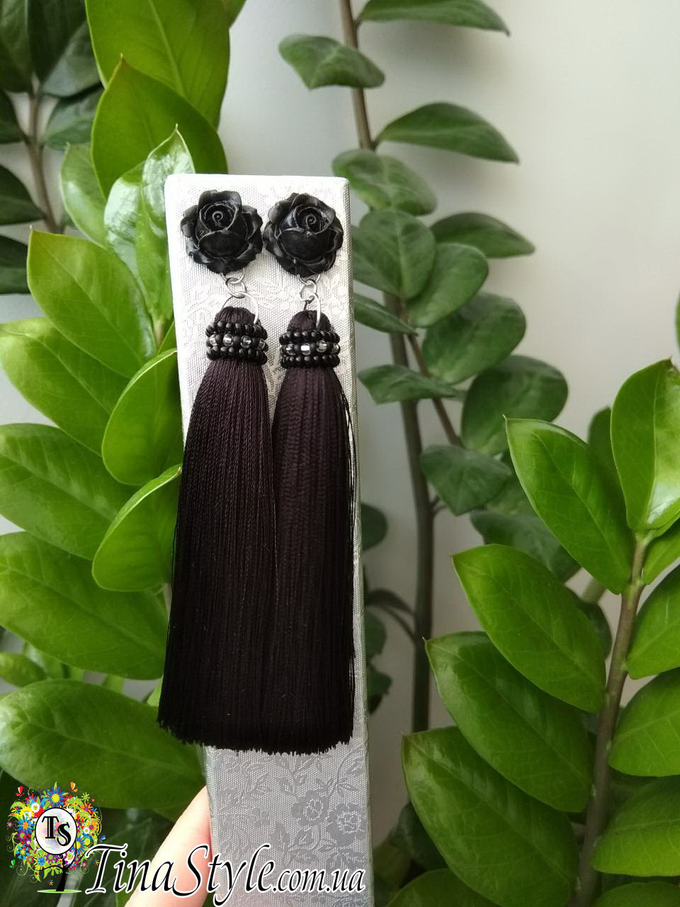 Сережки сережки пензля чорні з квіткою пензлика довгі висячі вечірнє НОВИНКА Пензлик чорний колір бісер квітка